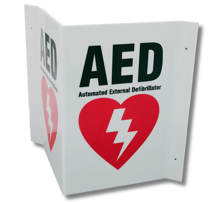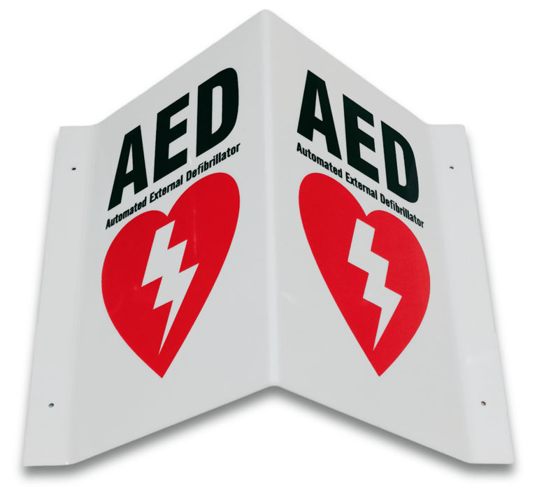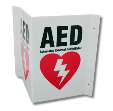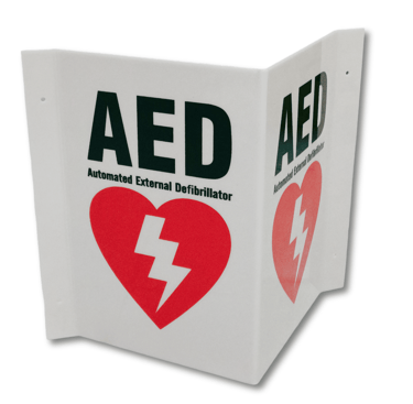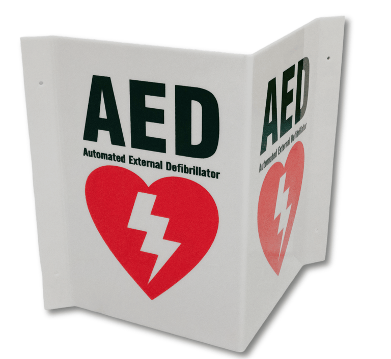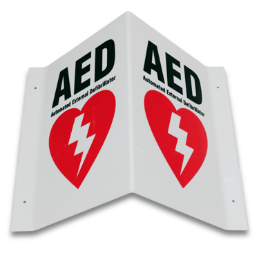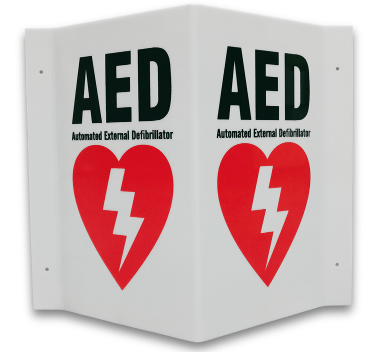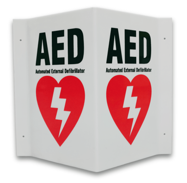 ป้ายแสดงสัญลักษณ์ AED เพื่อบ่งบอกจุดติดตั้งเครื่องเออีดี สามารถมองเห็นได้ในระยะไกล