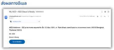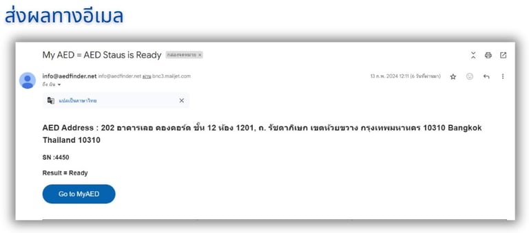 ผลที่ได้จะบอกถึงสถานะความพร้อมหรือไม่พร้อมใช้งานของเครื่องฯ ซึ่งเกิดจากความผิดปกติของเครื่องเออีดี เช่น แบตเตอรี่ต่ำ แผ่นนำไฟฟ้าหมดอายุ หรือ ไม่ถูกเชื่อมต่อ โดยผลลัพธ์ที่ได้จะแสดง ข้อมูลตัวเครื่อง และสถานที่ติดตั้งของเครื่องเออีดีผ่านโปรแกรมจัดการเครื่องเออีดี (MyAED) ทำให้ผู้ใช้งานสามารถ เข้าไปจัดการแก้ไขให้เครื่องเออีดีกลับมาพร้อมใช้งานได้ตามปกติ