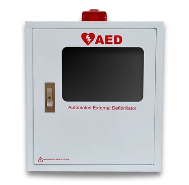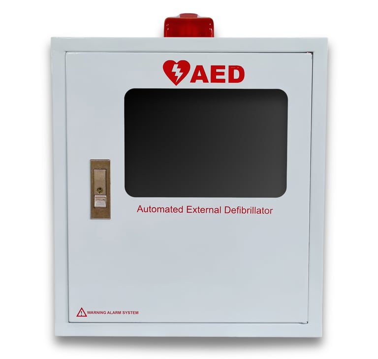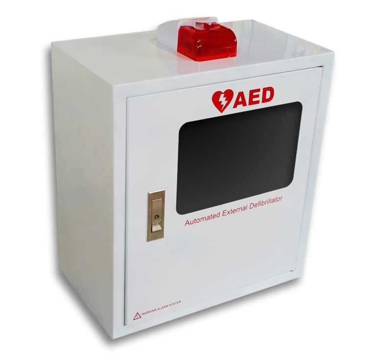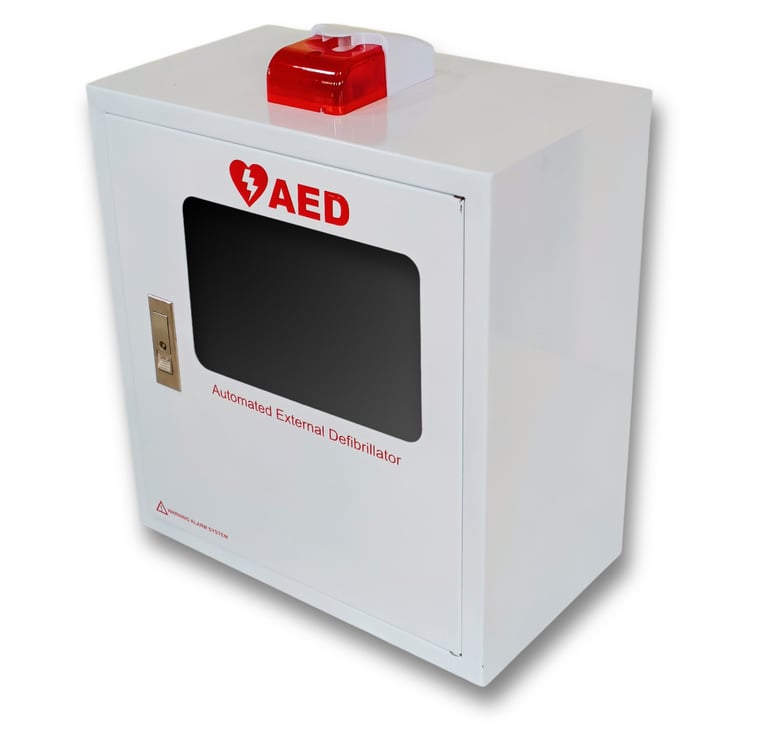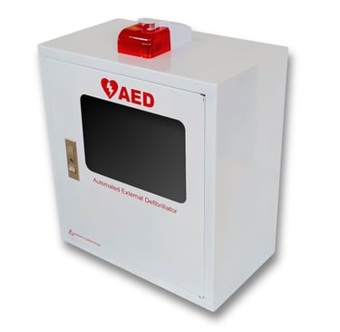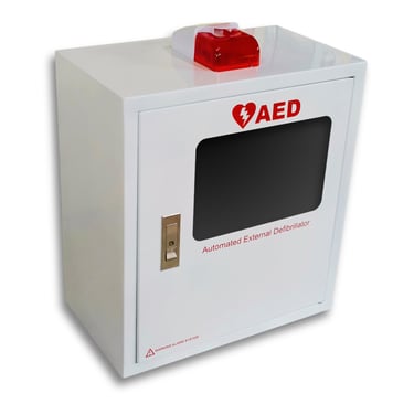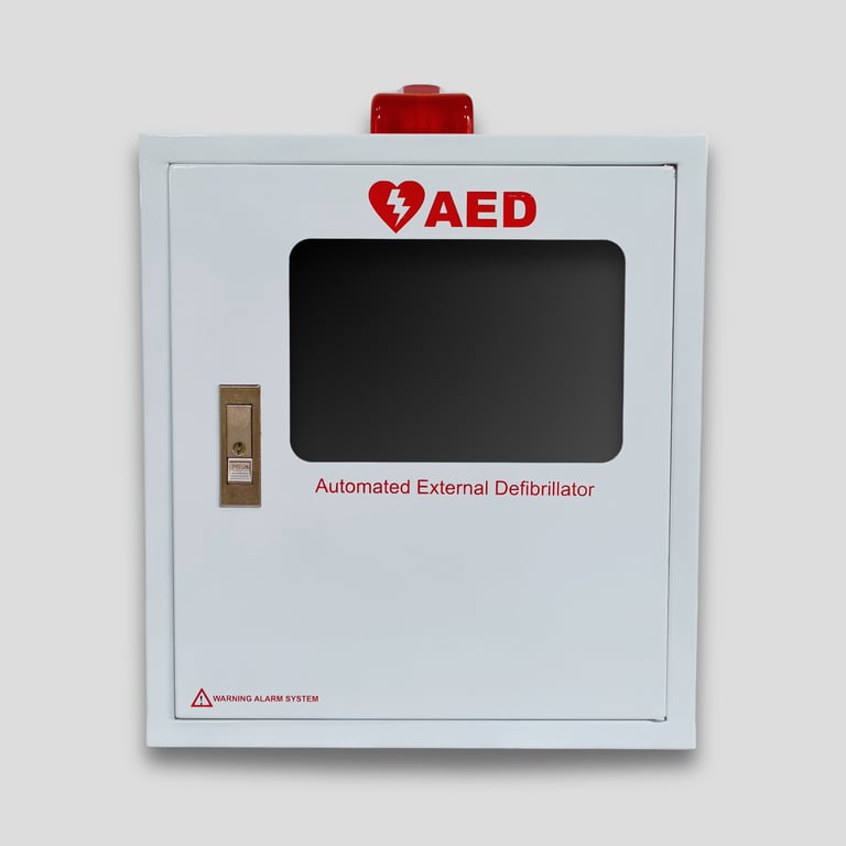 ตู้เออีดีแบบแขวนผนัง สำหรับใช้เก็บเครื่องกระตุกหัวใจแบบอัตโนมัติ หรือ AED ตู้สามารถแจ้งเตือนด้วยเสียงเมื่อมีการเปิดใช้งาน พร้อมทั้งไฟกระพริบ ทำให้ทราบได้ว่ามีเหตุฉุกเฉินเกิดขึ้น