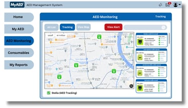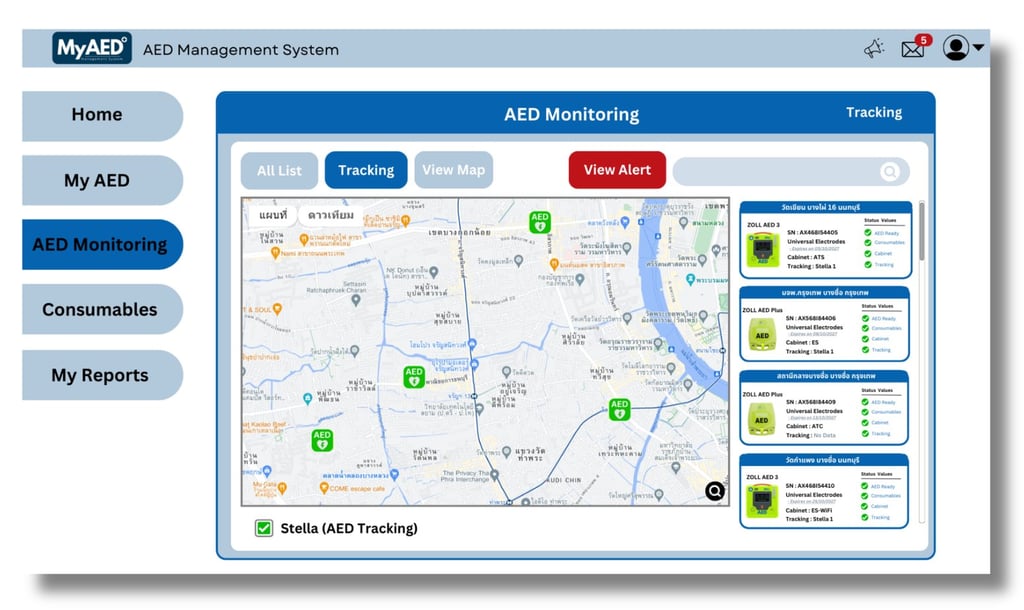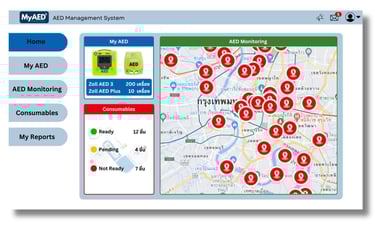 AED Monitoring คือฟังก์ชั่น แสดงข้อมูล สถานะ ชื่อสถานที่ และ ติดตามตำแหน่งของเครื่อง AED บนแผนที่ได้