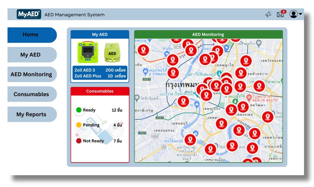 ระบบบริหารจัดการเครื่องกระตุกหัวใจแบบอัตโนมัติ (AED) ประกอบไปด้วย 5 ฟังก์ชั่นหลัก