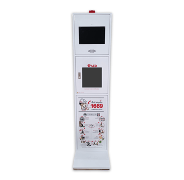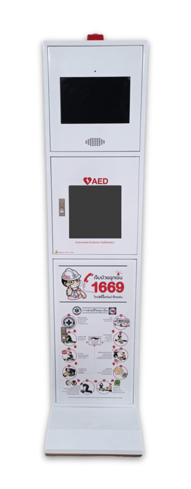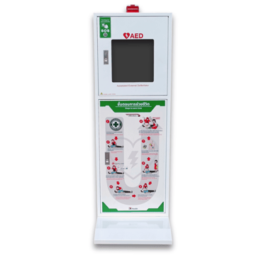 ตู้เออีดีแบบตั้งพื้น มีจอภาพสาธิตการทำ CPR และการใช้งานเครื่อง AED มีช่องด้านบนสำหรับใช้เก็บเครื่องกระตุกหัวใจแบบอัตโนมัติ หรือ AED และมีช่องด้านล่างสำหรับเก็บอุปกรณ์ช่วยชีวิตขั้นพื้นฐาน หรือ First Aid ตู้สามารถแจ้งเตือนด้วยเสียงเมื่อมีการเปิดใช้งาน พร้อมทั้งมีไฟกระพริบทำให้ทราบได้ว่ามีเหตุฉุกเฉินเกิดขึ้น