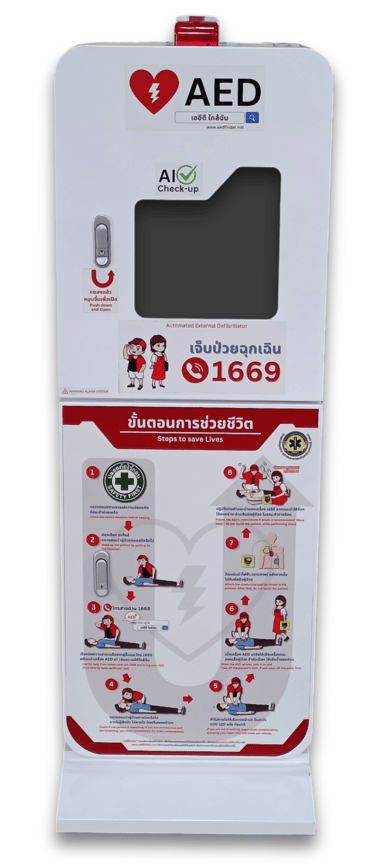 ตู้เออีดีแบบตั้งพื้นมีช่องด้านบนสำหรับใช้เก็บเครื่องกระตุกหัวใจแบบอัตโนมัติ หรือ AED และมีช่องด้านล่างสำหรับเก็บอุปกรณ์ช่วยชีวิตขั้นพื้นฐาน หรือ First Aid สัญญาณเสียงจะแจ้งเตือนขึ้นใน 3 กรณี